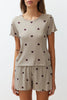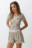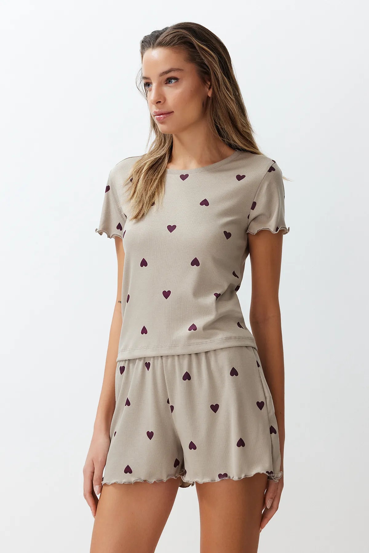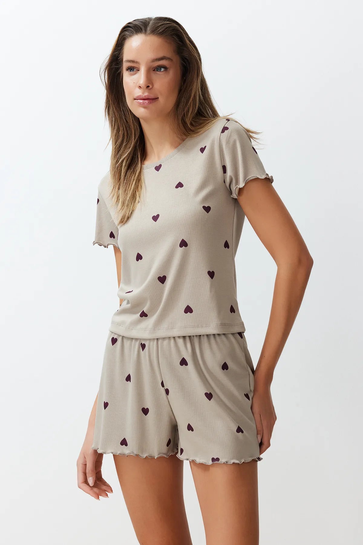 Mint Heart Slogan Printed Elastic Ribbed Shorts Knitted Pajama Set
