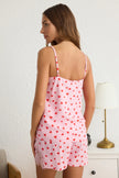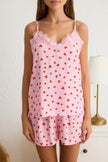 Pink-Multicolored Heart Lace Rope Strap Viscose Woven Pajama Set