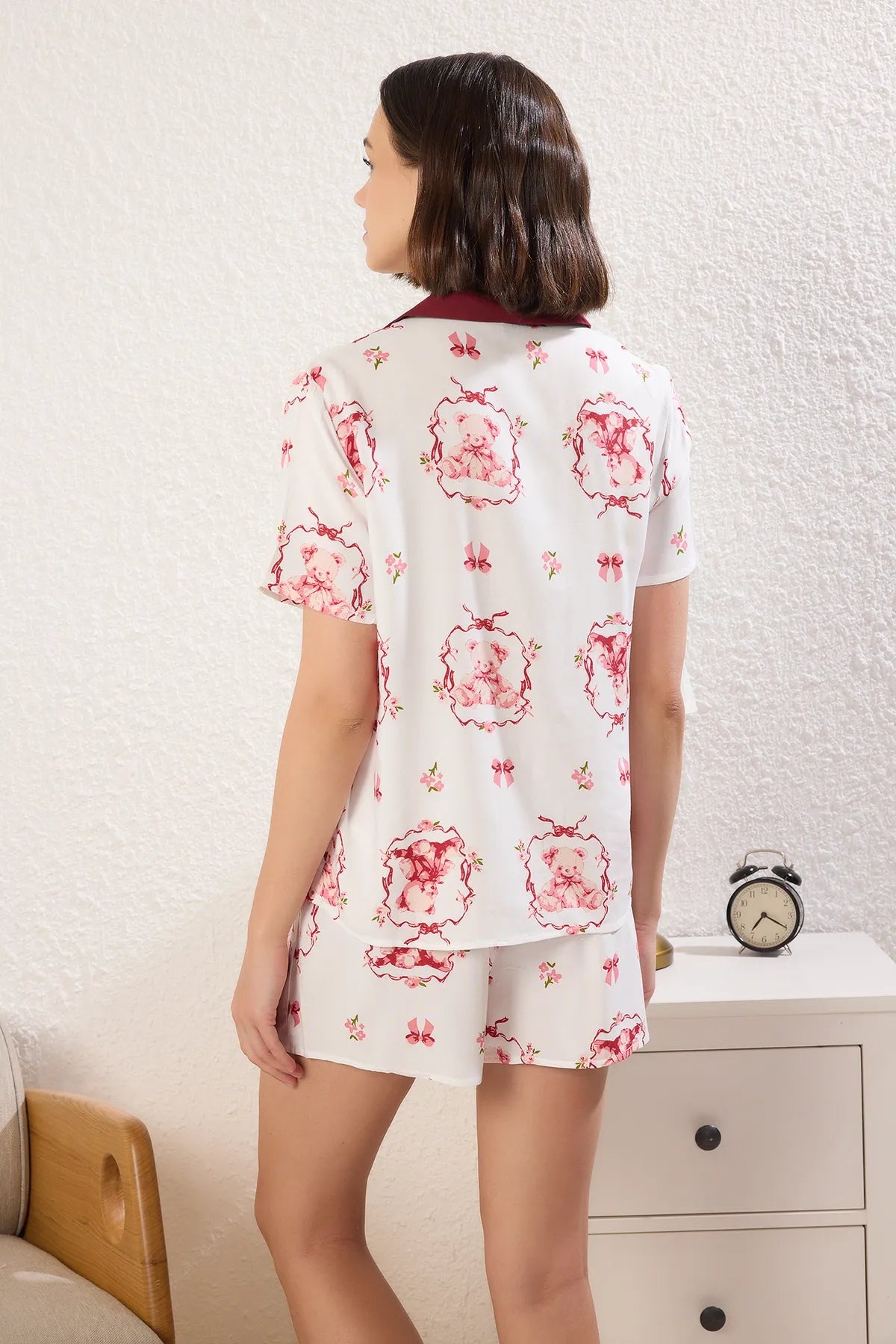 Multicolored Teddy Bear and Ribbon/Bow Patterned Viscose Shorts Woven Pajama Set