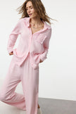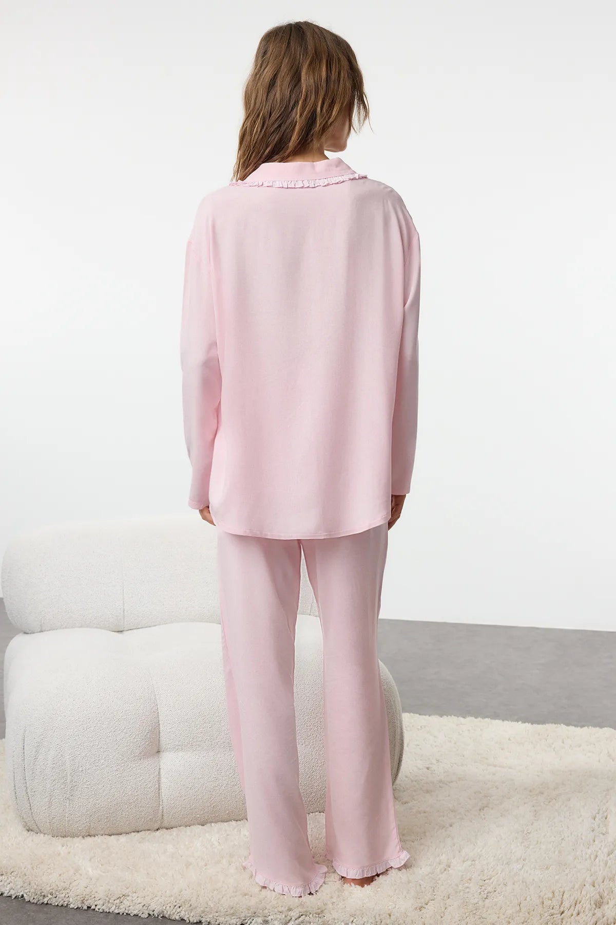 Pink Ruffle Pocket Detailed Viscose Woven Pajama Set