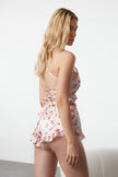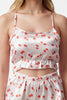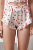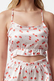 Powder-Colored Cherry Woven Pajama Set with Ruffle and Back Strap Satin Shorts