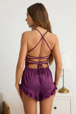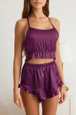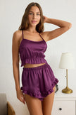Satin Woven Pajama Set with Plum Ruffle and Back Straps and Shorts